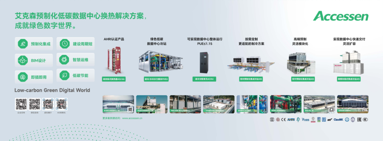 艾克森預制化低碳數據中心換熱解決方案,結合艾克森在換熱領域近二十多年產品技術和應用經驗,提供水冷和液冷的產品系列涵蓋了預制化集成冷站、AHRI認證高效板式換熱器、液冷水力模塊、液冷分配單元等核心產品組合,深度解析設備在能效提升、快速部署、安全運維、綠色低碳等維度的技術優(yōu)勢,助力數據中心客戶突破傳統(tǒng)、不斷創(chuàng)新迭代實現數據中心可持續(xù)發(fā)展。